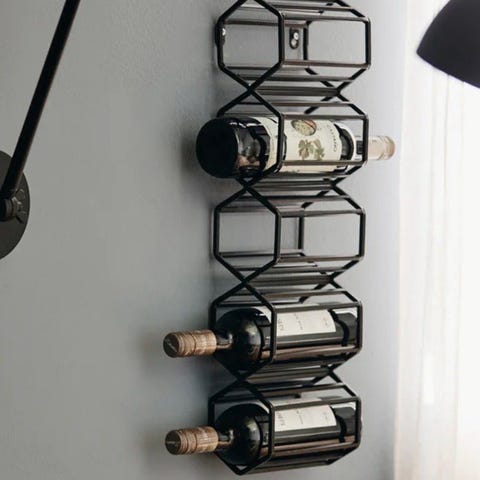 Meget flot sort jern vinreol til 6 flasker. Den kan enten hænge på væggen eller stå på gulvet op ad en væg.