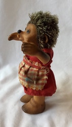 Mucki, Steiff, Den søde pindsvinepige Mucki fra Steiff med rødternet forklæde i fin stand i gummi, h 12 cm sælges kr 350,-. Fragten aftales individuelt!