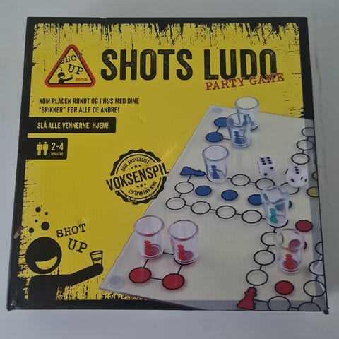 Brikkerne er byttet ud med shotsglas og der skal drikkes et shot, hver gang nogen slås hjem. Til gengæld må du give et shot ud og hver gang du får en brik i mål. Dette ludo drukspil er et sjovt og festligt spil, som dine venner vil elske.