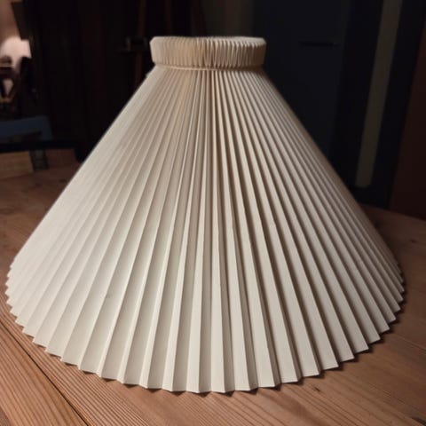 Den største af plisseskærmene fra Le Klint model 1-38 med lidt brugsspor sælges uden stativ. Her er brugt stativ 403.