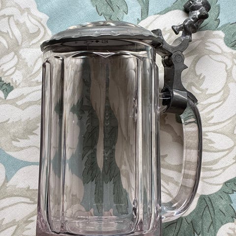 Glas, Ølkrus, Stort gammelt tungt glas ølkrus med tinlåg, signeret i låget H.Wild og indgraveret Willy 0,5 L , låget sidder lidt løst. Glasset er Mærket med en krone i bunden. Fragten aftales individuelt!