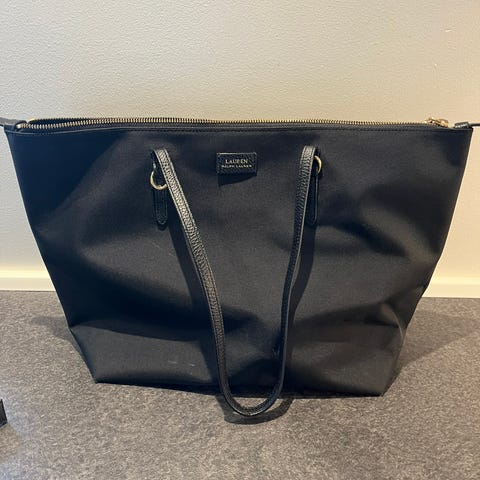Skuldertaske, Ralph Lauren, Ralph Lauren blød stof skuldertaske med udvendig lomme og indvendig lynlåslomme, lidt misfarvet ved lynlåsen derfor prisen! kr 375,-. Fragten aftales individuelt!