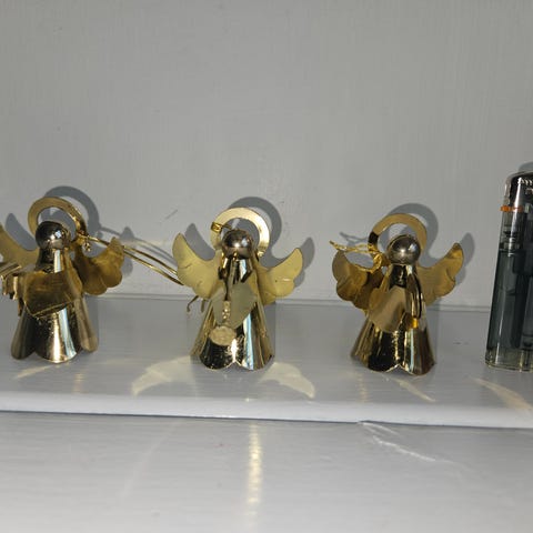 Messing engel med instrument, Fin messing engel med glorie og instrument. Ca 6 cm høj.