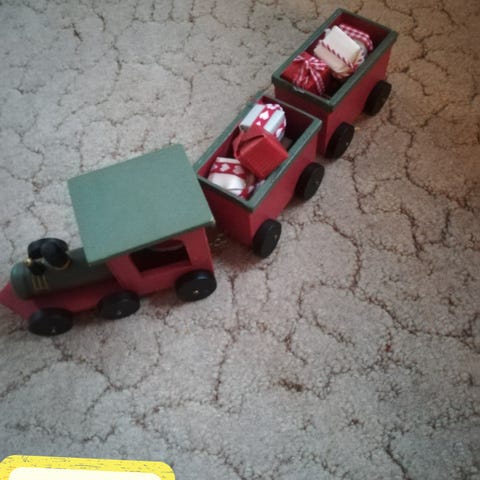 Fint påske tog i gult med lokomotiv og 3 vogne, har fået et nyt hjul på lokomotivet