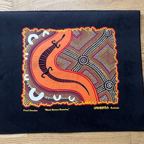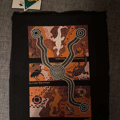 Stoftryk, Australian Aboriginal Art, motiv: Water Hole Dreaming, Meget smuk taske/net med snorelukning i kraftig kanvaskvalitet.. Kunstneren hedder Linda Brown Nabanunga og det forestiller "Water Hole Dreaming". Samme motiv på begge sider. Motiverne kan indrammes og er meget dekorative. Motivet måler 25x33 cm og tasken 35x50 cm.