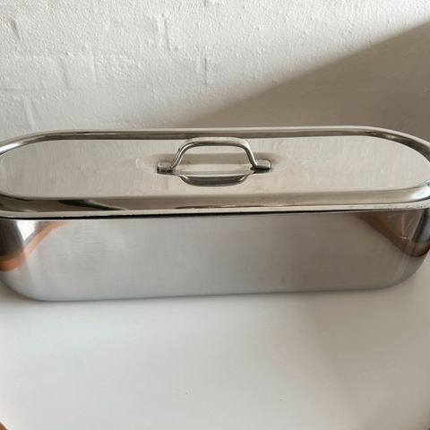 Fiskegryde, Fransk aluminium fiskegryde, som ny, der også er perfekt til krydderurter der kan stå på bundristen og suge vand. Medbringes Århus/Kbh.