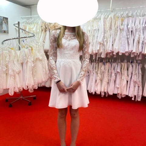 Konfirmationskjole, Brudedesign, str. 38-40, Den smukkeste konfirmationskjole er klar til at komme videre. Den er købt hos Brudedesign i Greve. Det er ikke en standardmodel, da vores datter valgte at få den syet om og sætte sit eget præg på kjolen.