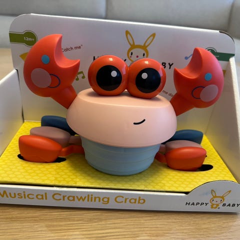 Andet legetøj, Krabbe med opladning :), Walking Crab er en legende krabbe, der opmuntrer børn til at bevæge sig rundt og kravle efter krabben. Krabben bevæger sig og ændrer retning ved hjælp af sensorer. Den ændre retning , når den nærmer sig en person eller et objekt. Krabben laver desuden legende lyde og udsender lys, men dette kan slås fra. Den har afrundede kanter og den kan tåle at blive slået. Der er en lille oplader med, så man er fri for at købe batterier. Krabberne er helt nye og aldrig brugt.