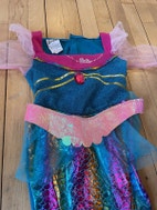 Kjole, Havfrue-kjole, Barbie, str. findes i flere str., Flot kjole i størrelse 3-4 år med tilhørende bælte (som dog var for stort til mit barn, men kjolen ser også flot ud uden bæltet, og det kan sikkert nemt forkortes, hvis man er lidt kreativ). Kjolen er et godt havfrue-kostume til fastelavn ??