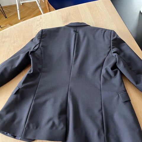 Navy blå, Se billede 4 krøllet nede under det ene ærme har mærket med hvid cirkel. Kan ikke ses når blazeren er på.