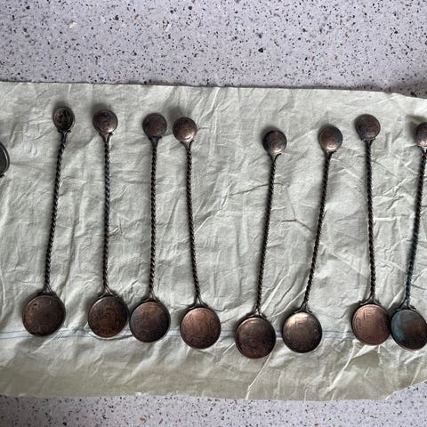 Håndlavede skeer, 6 flotte håndlavede skeer L 17 cm med snoet skaft og mønter fra CX 5 øre 1914 og CX 1 øre 1913 i gammel æske fra juveler og guldsmed B. Bruun. Møntskeer fra Christian den 10. Memoralia fra en svunden tid sælges kr 1200,-. Fragten aftales individuelt!