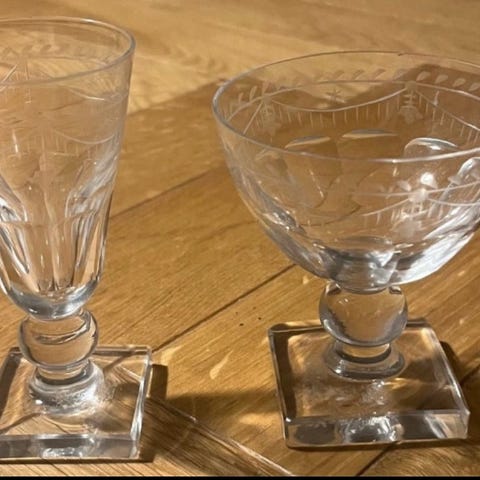 Glas, Krystalglas, Gorham model “Sonja”, 2 diamant slebne vinglas fra Gorham, modellen hedder “Sonja”. Jeg er usikker på om det er rødvin eller hvidvinsglas. Kraftige og holdbare med et helt vidunderligt lysspil. Prisen er for begge.