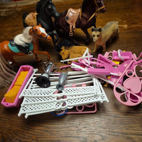 Heste og hunde i plastik fra 1990'erne. De har en del brugsspor. Har været brugt til Barbie.