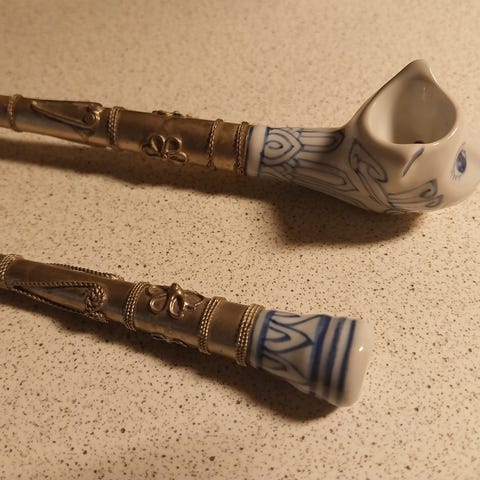 Porcelæn, Kridtpiber, Unik samling af Hollandske gouda kridtpiber med porcelæn tobak krukke, alder ca 60-65 år.
