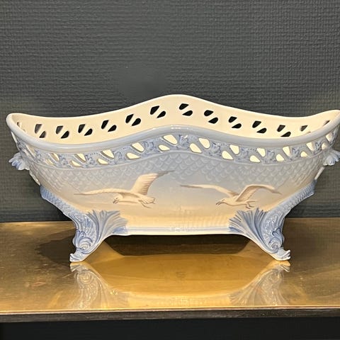 Porcelæn, Jardiniere / skål nr. 69 Mågestel, Bing og Grøndahl B&G, Gammel, sjælden og meget smuk jardiniere / skål til mågestel. 2. sortering. Har et lille skår på det ene håndtag, men det er limet på igen og ses stort set ikke (se billede 6). L: 38 cm. B: 23 cm. H: 16 cm.
