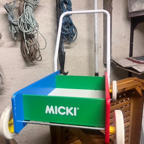 Micki gåvogn i træ med et multifarvet design. Vognen har en robust konstruktion og er ideel til små børn, der lærer at gå. Den er udstyret med et håndtag i passende højde og fire hjul for stabilitet. Egnet til indendørs brug.
