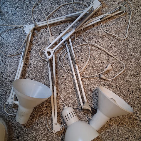 Der kan henvises til flere lignende arbejdslamper på mine annoncer og i forskellige farver og priser og nogle ses under fotos med bla en Flot grå, der kan bruges såvel til bord og til ophæng på væg (original beslag medfølger) - perfekt led hvor lamper kan vendes i retninger og til lille fatning - måler 26 cm dyb, selve skærm-del H: 20 og D: 16 på fod til 199,-