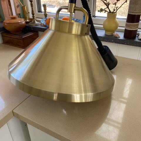 Pendel, Gammel messing loftslampe til over spisebord sælges. Den har få brugsspor alderen i betragtning på skærmen - se billeder. Den har indbygget hejs i ledningen så den let kan justeres i højden over bordet.