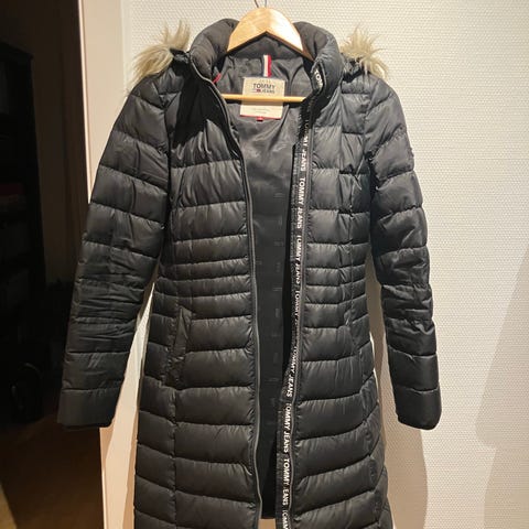 Vinterfrakke, str. 36, Tommy Hilfiger, Sort, Dunfrakke, Næsten som ny, Lækker lang dunfrakke, med aftagelig hætte og pelskant. Faconsyet og fremstår fuldstændig som ny, kun brugt ganske få gange, ny pris ca. 2.500,-