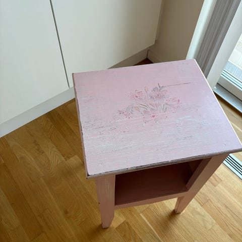 Smukt, unikt lille lyserødt sengebord i ornamenteret træ