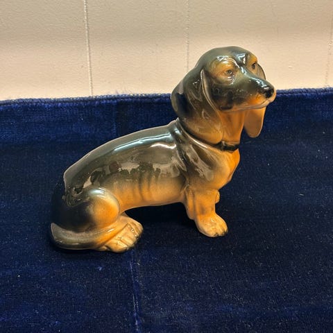 Porcelænshund, Gammel charmerende gravhund i porcelæn. Den er meget tung. Den stammer muligvis fra Frankrig. Den har lidt afslag som ses på billedet.