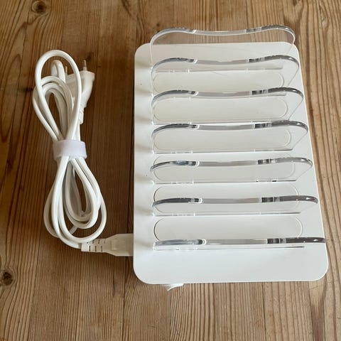 Holder, Stelton Ladestation, Super Charger fra Stetlon, til at samle og skjule opladere til mobiltelefonerne