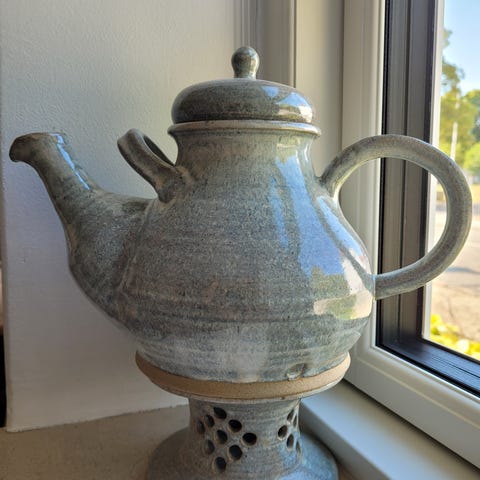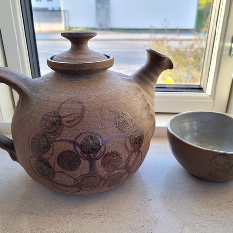 Stentøj, Tekande, fyrfadsvarmer og 7 krus, KK Danmark, Smukt hånddrejet tekande med fyrfadsvarmer og 7 matchende krus. Fra K K Danmark (=Karlslunde Keramik). Tekanden rummer knap 2,5 liter. Fra slutningen af 1980’erne (så dermed fin glasur uden grim kemi). Har ikke været i brug de sidste 15-20 år. Fra røgfrit hjem. Sender gerne