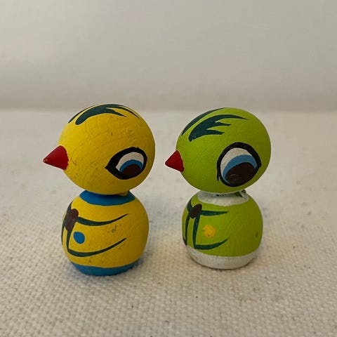 Andre samleobjekter, Påske kylling, 2 smukke håndmalede Mogens Eigenbrod kyllinger, den grønne med plads til lys er limet ved halen, se foto, den gule er met fin, sælges samlet, h 5 cm kr 350,-. Fragten aftales individuelt!