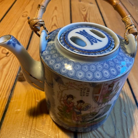 Porcelæn, Tepotte, Nydelig lille porcelæns tepotte, bemalet i blåt - knap nok til 1 liter - med hyggeligt håndtag af bambus.