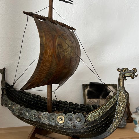 Kongelig Vikingskib Skål Fra 1910, Porcelæn, 114 år gl., Flot gammel skål formet som et vikingeskib med motiv af en viking fra 1910. Den er lavet for Gosch Tændstiksfabrik.