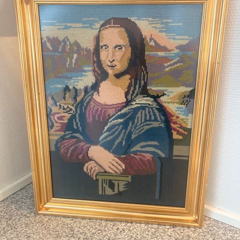 Stort håndbroderet billede af Mona Lisa, Smukt håndbroderet billede af Mona Lisa måler. 56x42 cm virkelig kitch /retro billede hvis du vil have noget specielt på din væg