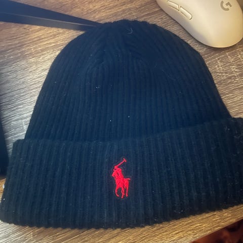Hue, Ralph Lauren Polo, str. One Size, Rød sort skrift, Uld og akryl, God men brugt, Fin strikhue