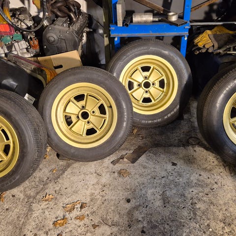 Hjul , Lotus, 5 stk. originale Lotus stålfælge sandblæst, autolakeret og med fine klassiske dæk i hhv. 185 for og 205 bag.