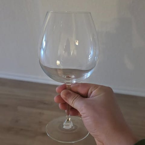 4 meget store rødvinsglas. Fyldt til randen rummer de en halv liter.