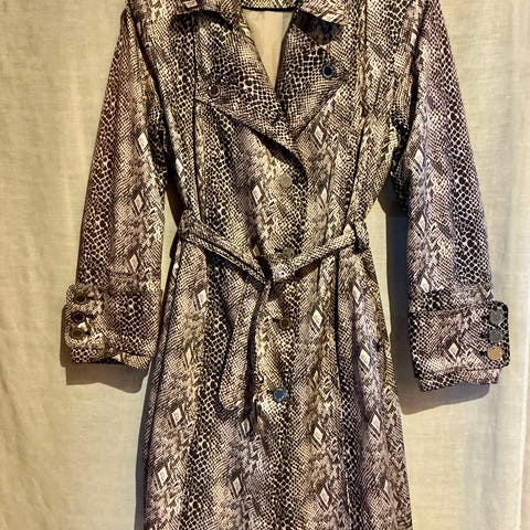 Trenchcoat, str. 42, Julien MacDonald, Sort beige slange mønster , Næsten som ny, Lækker dame jakke med mange detaljer og beige foer. Er kun brugt et par gange da den er lidt for lille til mig. Men super smart og mange detaljer inklusiv bælte.