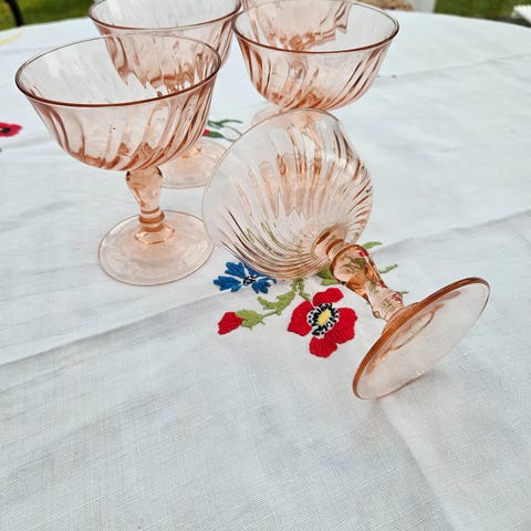 Glas, Vintage skål, Fransk rosaline, Smuk vintage glasskål fra 1930’erne i Art Deco stil. Der er et fint blomstermønster i det lyserøde glas og en hank af træ. I god stand.
