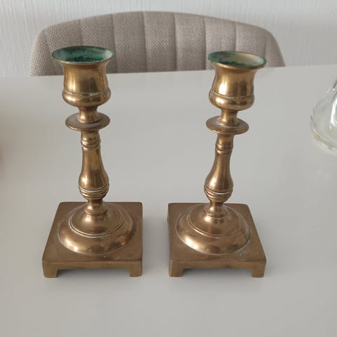 2 messingstager med dekorationer.