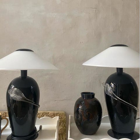 Fotos her er af mindre bord Lampe hvor.mål.på.skærm glas er 10 cm i.diameter og 12 cm.højden. Meget flotte fancy design lamper.Ny pris var ca 8000 kroner for alle lamper. Sælges samlet for 1200 kroner