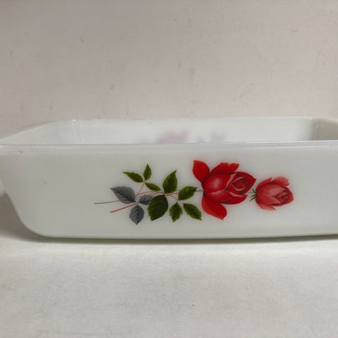 Ovnfast retro fad, opalhvid m/blomstermotiver, mrk JAJ/made in England. Måler 28x18,5x7 cm. Kan gå fra fryser til ovn. Meget fin stand, ingen afslag, rent og pænt.