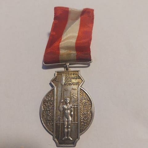 Medalje, Rosport 1954, Medalje fra Dansk Forening for Rosport. Ligner sølv men er ikke stemplet. Bagpå er indgraveret 27-6-54 så formodentlig fra et mesterskab/stævne dengang. Der er ogå et stempel forneden i småt som ligber “ornæs”. Har formodentlig siddet i et bånd. Måler 4x3cm og er i fin stand.