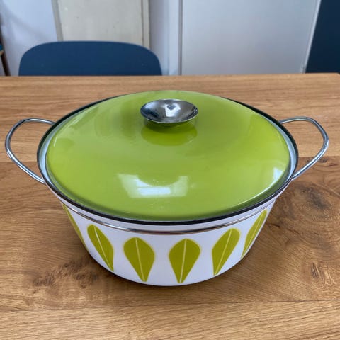 Gryde 400 kr. Gryde grøn Retro gryde med låg 400kr Cathrineholm – grøn lotus: retro gryde Emaljeret mindre gryde i serien lotus fra Norske Cathrineholm. Blå og hvid emalje. Design Grete Prytz Kittelsen. Emaljen er har slag. Se billede.
