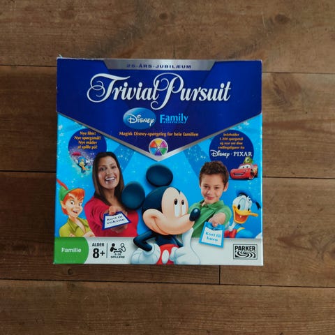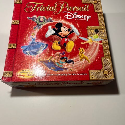 Disney Trivial Pursuit, brætspil, Der mangler ét spørgsmålskort ellers er alle dele der. Der er lidt slidt i samlingen på pladen og uden på æsken. Der er en revne i foden der holder bogen.