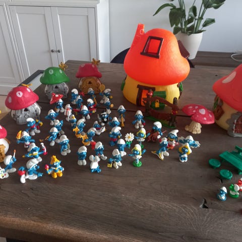 Smølfer, Smølfer og smølfehus, Forskellige smøllfer med tilbehør samt et lille svampe smølfehus. Det hele er i flot stand, ellers står det i teksten.