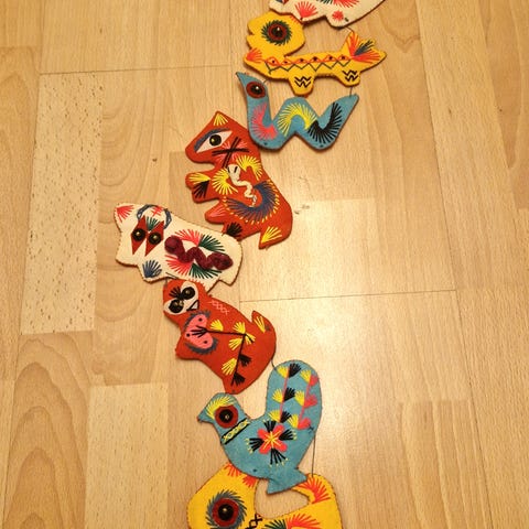 Kinesisk Zodiac med de 12 dyresymboler i små, syede figurer med broderede detaljer, der hænger under hinanden. Længde ca. 130 cm incl. kvast: