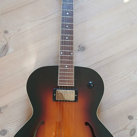 Virkelig fantastisk helakustisk jazzguitar med stor akustisk lyd og flydende mini humbugger. Den er 100 % som fabriksny over alt, ingen båndslid. Pose følger med.
