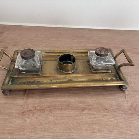 Blækhus og pennebakke i bronze, Bronze, Flot blækhus i glas og messing samt pennebakke i messing.