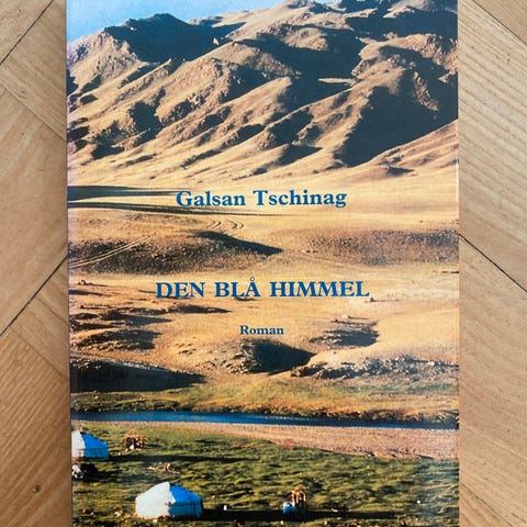 "Forfatteren er fra Mongoliet og af tuviner-folket. Han har fået sin uddannelse i det tidligere DDR og har et større tysksproget forfatterskab bag sig. "Den blå himmel" er første del af en delvis selvbiografisk romantrilogi og hans første bog på dansk. Fortælleren er en 6-7 årig dreng i en nomade familie. Han har sammen med sin elskede hund ansvaret for en lille flok af de yngste får og geder og oplever i romanens forløb tre store brud: Først tager hans ældre søskende på kostskole, siden dør en gammel kvinde, som han helt har knyttet sig til som sin bedstemor, og endelig fuldbyrdes katastrofen, da den drøm, der indleder bogen - hvor han mister sin hund - går i opfyldelse. Han bryder for alvor med alle autoriteter - både guder og forældre. Det er en klassisk dannelsesroman, selv om de afgørende forandringer sætter noget tidligt ind hos drengen. Samtidig er det en roman om et meget barsk nomadeliv i en kultur, vi litterært har været tættest på med Ajtmatovs romaner fra Kirgisien. Tschinag er også shaman, hvilket hans ofte drømmeagtige skrivemåde bærer præg af. Han bruger en stor del mongolske udtryk undervejs, hvorfor den afsluttende ordliste er meget nødvendig for udbyttet. Bogen afsluttes med et grundigt efterskrift af Steen Klitgård-Povlsen".