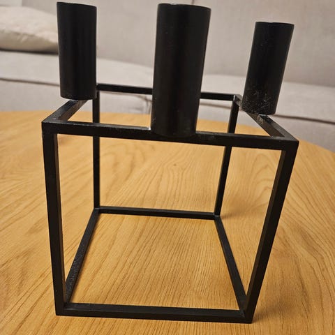 Lysestage, Kubusstage i sort inklusiv fint kors. Der er lidt stearin i bunden du må selv må fjerne.