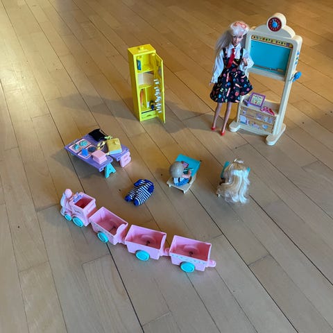 Barbie, skolesæt, Skolesæt med kridttavle (inkl et lille kridt), globus og stol sælges.