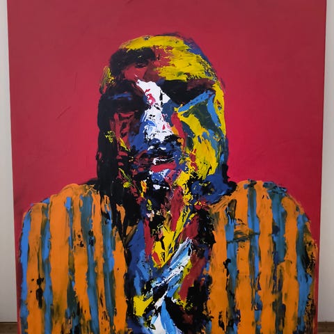#1 Nielsson, motiv af person på rød baggrund. Meget stort akrylmaleri 100x150 cm. Kr. 3.800. SOLGT